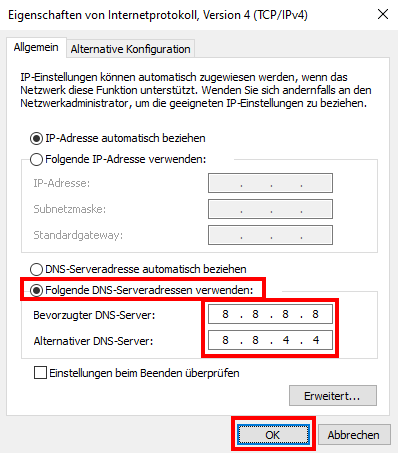 - 8.8.8.8 und 8.8.4.4 eintragen und Ok anklicken