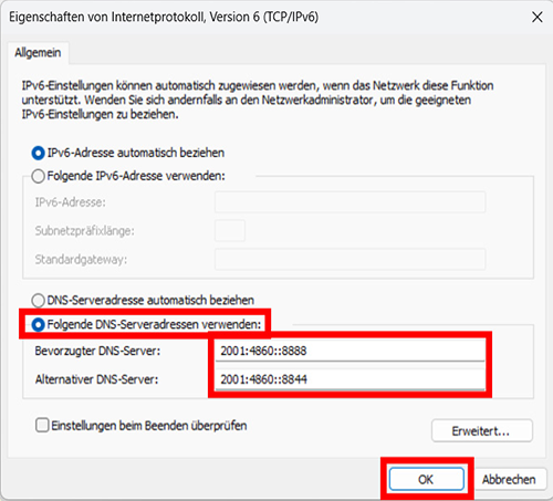 - 2001:4860::8888 und 2001:4860::8844 eintragen und Ok anklicken